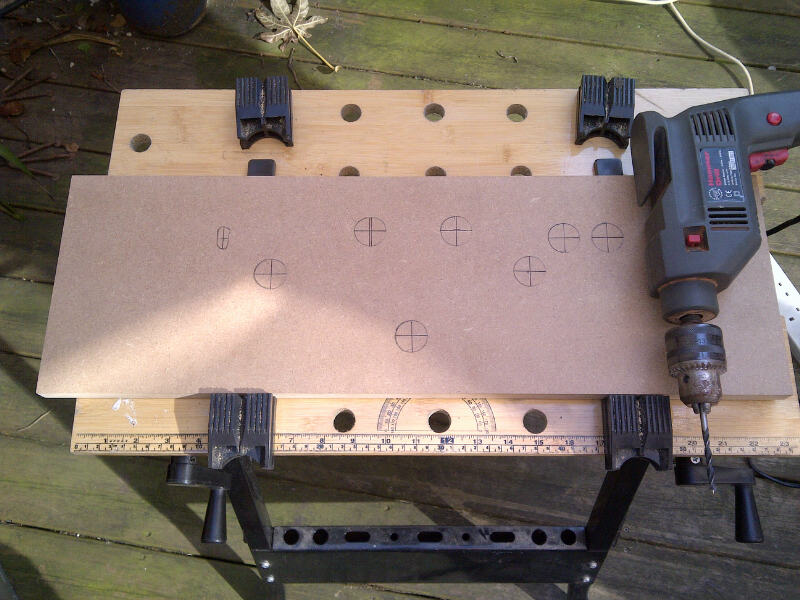 Get control panel overlay, and new plywood board and hold them together with a big crocodile clip so that we can begin to make out where the controls need to be.